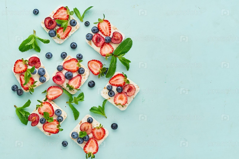 Хрустящие булочки Rise с ягодами и фруктами, красочная концепция на бирюзово-аквамариновом фоне