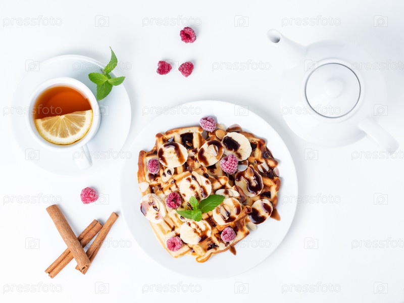 Бельгийские творожные вафли с малиной, бананом, шоколадным сиропом. Завтрак с чаем на белом фоне, вид сверху
