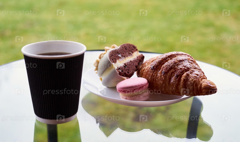 Завтрак с круассаном и десертом, кофе или чай в пластиковой кружке, в деревне, на открытом воздухе, природа