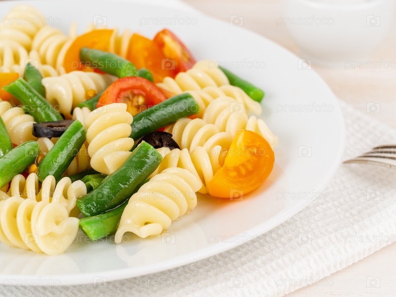 Итальянский салат с пастой фузилли, помидорами, оливками, стручковой фасолью, часть, вид сбоку, крупный план