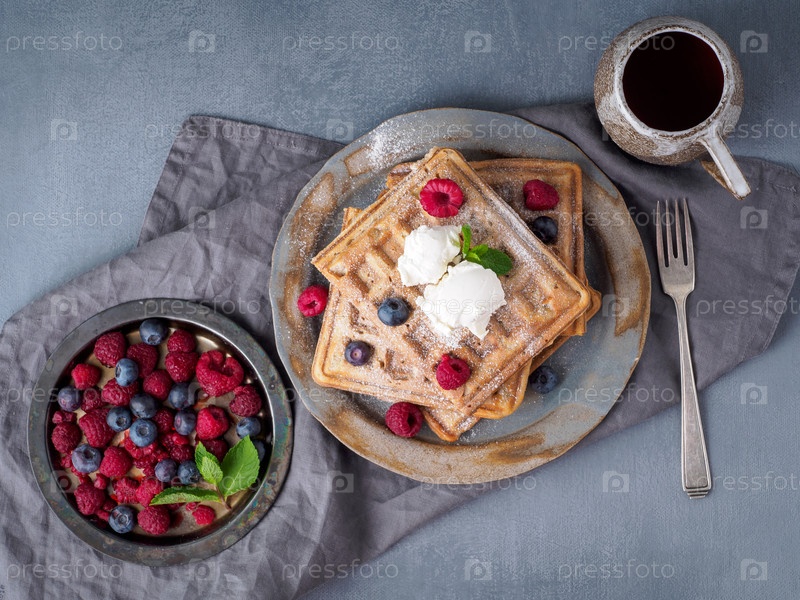 Бельгийские вафли с малиной, шоколадный сироп. Завтрак с чаем на темном фоне, вид сверху