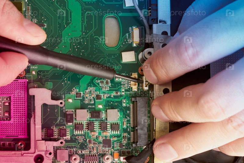 Мужчина ремонтирует компьютер. Инженер по ремонту в рубашке ремонтирует ноутбук, за белым столом на фоне белой стены. Фон материнской платы компьютера с размытым неоновым многоцветным свечением. Руки крупным планом