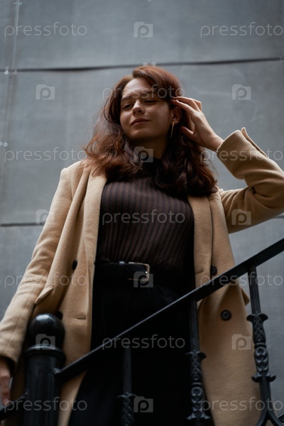 Красивая серьезная стильная модная умная девушка стоит на лестнице, город Санкт-Петербург. Очаровательная вдумчивая женщина с длинными темными волосами, снимающая снизу