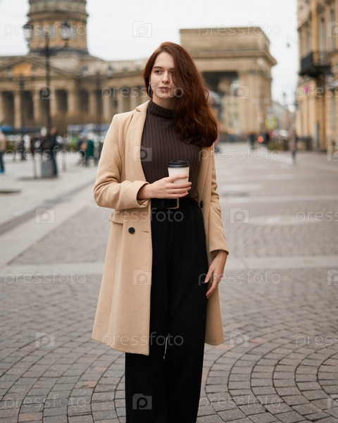 Красивая серьезная стильная модная умная девушка держит чашку кофе в руках идет по улице Санкт-Петербурга в центре города. Очаровательная вдумчивая женщина с длинными темными волосами