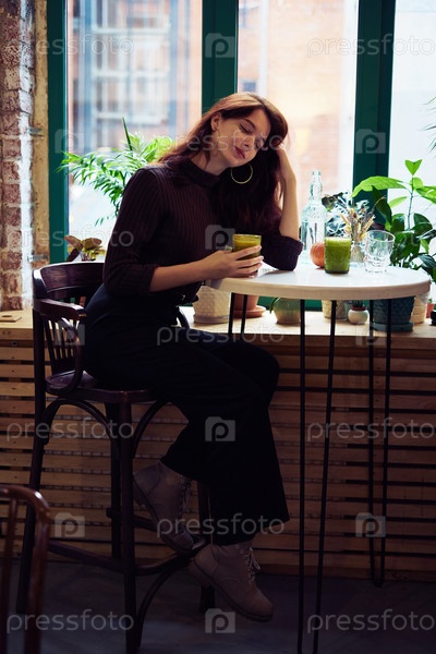 Красивая серьезная стильная модная умная девушка сидит в кафе и пьет полезный смузи или латте веганский. Очаровательная вдумчивая женщина с длинными темно-каштановыми волосами