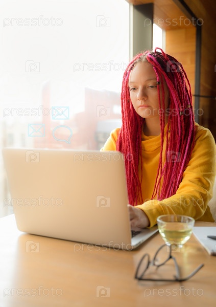 Концепция цифрового кочевника. Девушка-фрилансер, удаленно работающая на ноутбуке в кафе, коворкинге