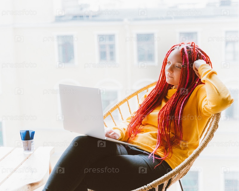 Концепция цифрового кочевника. Девушка-фрилансер, удаленно работающая на ноутбуке в кафе, коворкинге