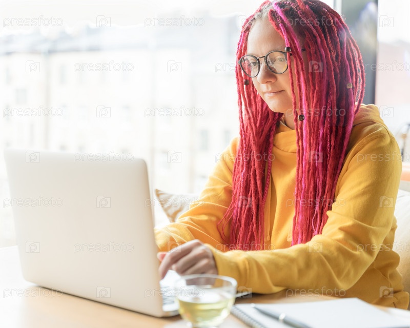 Концепция цифрового кочевника. Девушка-фрилансер, удаленно работающая на ноутбуке в кафе, коворкинге