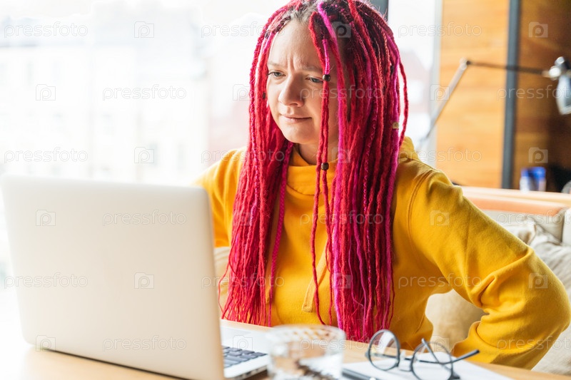 Концепция цифрового кочевника. Девушка-фрилансер, удаленно работающая на ноутбуке в кафе, коворкинге