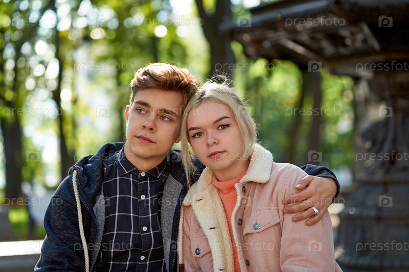Девушка и парень влюбляются, сидят и мечтают в парке возле фонтана осенью. Концепция любви и счастья