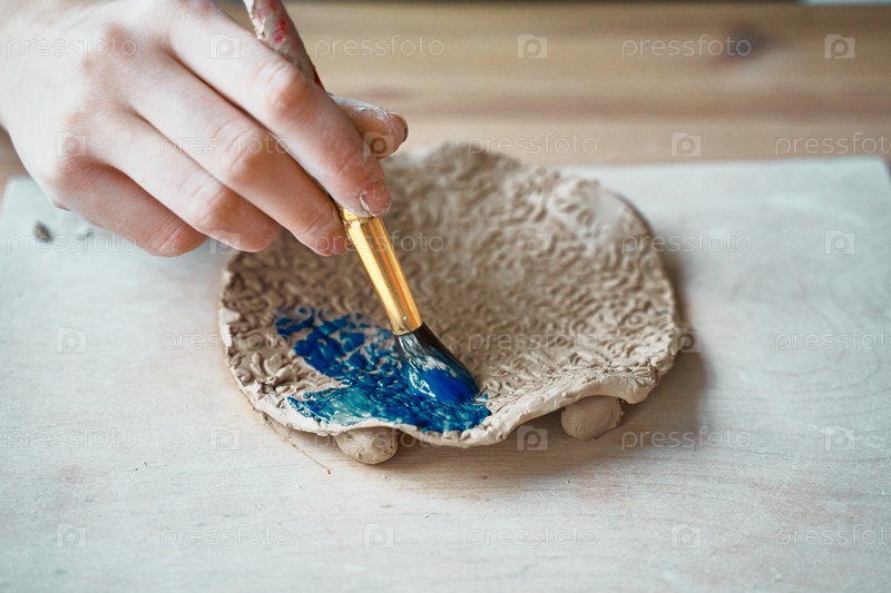 Неопознанная женщина рисует узор на керамической тарелке, руки крупным планом