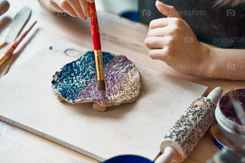 Неопознанная женщина делает узор на керамической тарелке, руки крупным планом, фокус на ладонях с кистью. Творческая концепция хобби. Зарабатывайте дополнительные деньги, подработка, превращайте хобби в деньги, страсть в работу