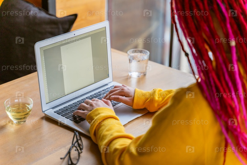 Концепция цифрового кочевника. Девушка-фрилансер, удаленно работающая на ноутбуке в кафе, коворкинге