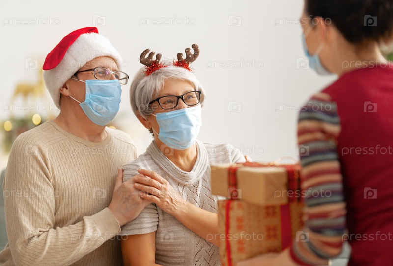 Люди с подарками в масках на Рождество