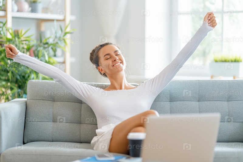 Женщина работает дома за ноутбуком