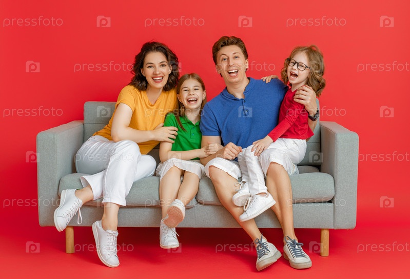 Счастливая любящая семья на ярком цветном фоне
