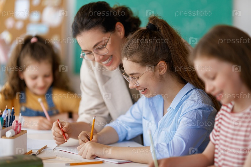 Счастливые дети и учитель в школе