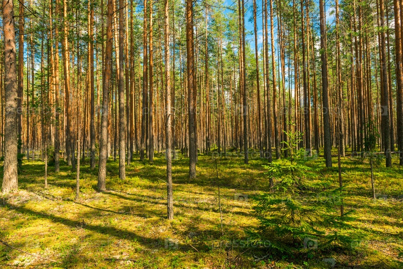 Хвойный зеленый сосновый лесной пейзаж летом, Карелия, Россия