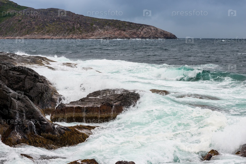 Опасная морская волна обрушивается на скалистое побережье с брызгами и пеной перед штормом в Баренцевом море