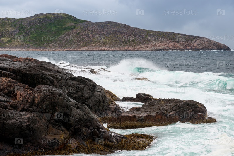 Опасная морская волна обрушивается на скалистое побережье с брызгами и пеной перед штормом в Баренцевом море