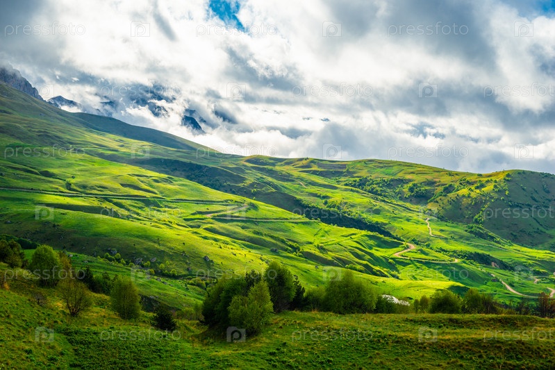 Живописные горы в прекрасных облаках Северного Кавказа. Россия