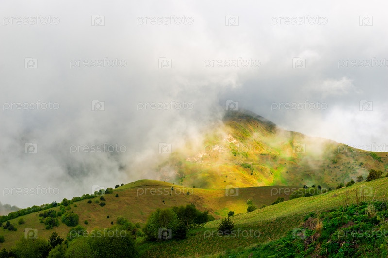 Живописные горы в прекрасных облаках Северного Кавказа. Россия