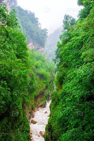 Бурная горная река в глубоком узком живописном зеленом каньоне. Северный Кавказ. Россия