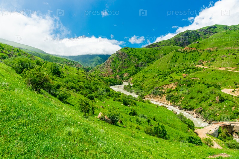 Горная река в живописном зеленом каньоне в ясную солнечную погоду. Северный Кавказ. Россия