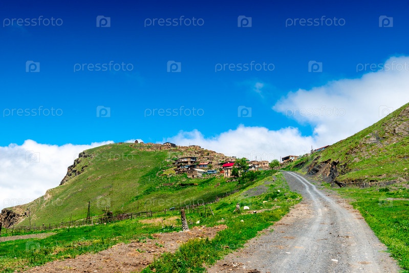 Дорога в деревню на зеленом склоне высоко в горах Северного Кавказа. Россия