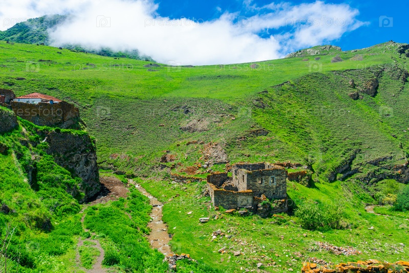 Древние живописные руины горного села Галиат. Северный Кавказ. Россия