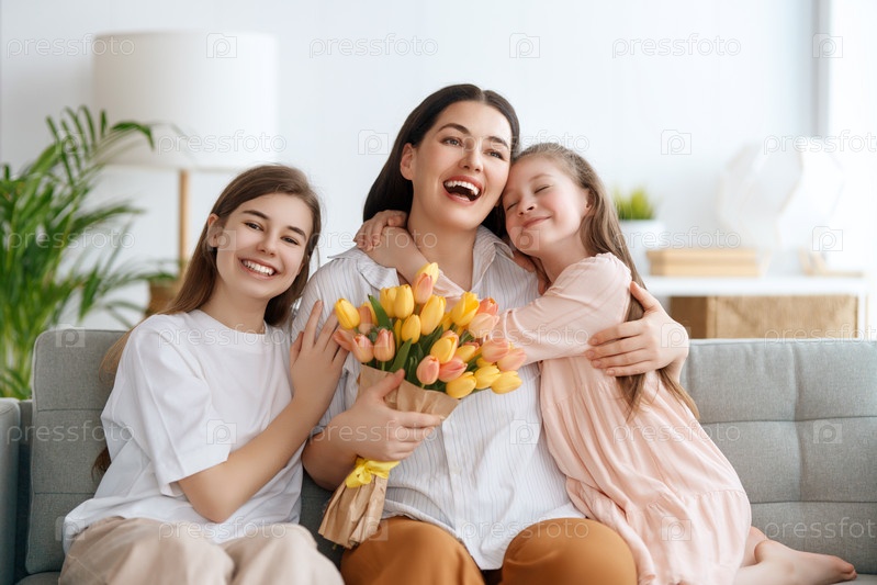 Дочери и мама с цветами