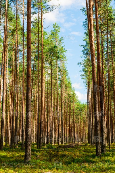 Хвойный зеленый сосновый лесной пейзаж летом, Карелия, Россия