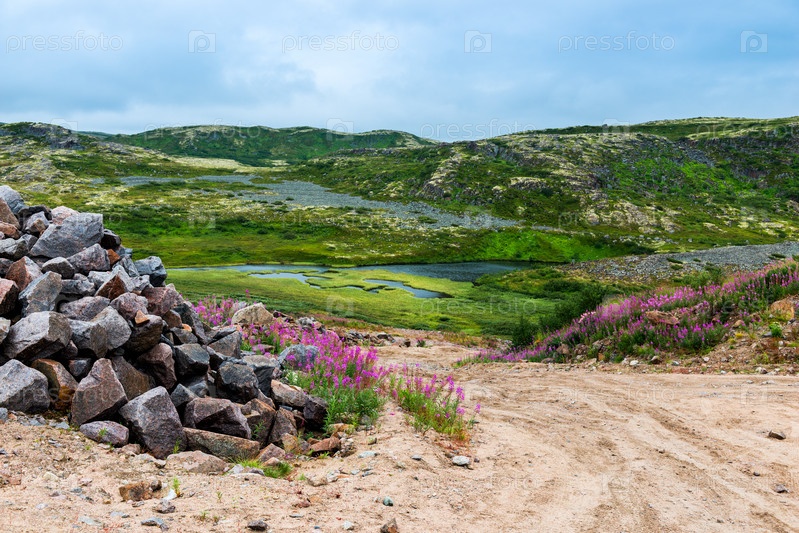 Грунтовая дорога в полярном ландшафте с гранитными камнями и растениями