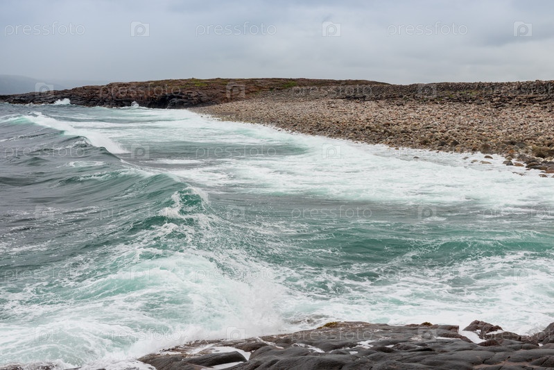 Опасная морская волна обрушивается на скалистое побережье с брызгами и пеной перед штормом в Баренцевом море