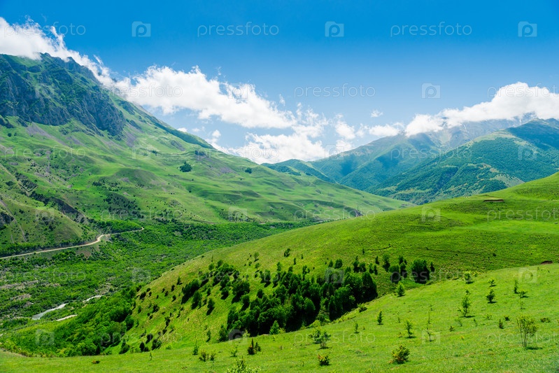 Зеленая долина на месте схода ледника Колка. Кармадонское ущелье в горах Северного Кавказа. Россия