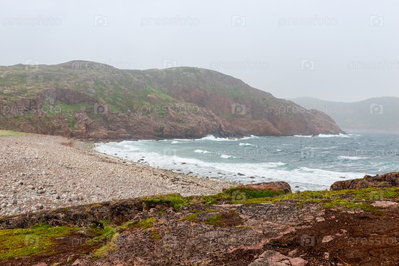 Опасная морская волна обрушивается на скалистое побережье с брызгами и пеной перед штормом в Баренцевом море