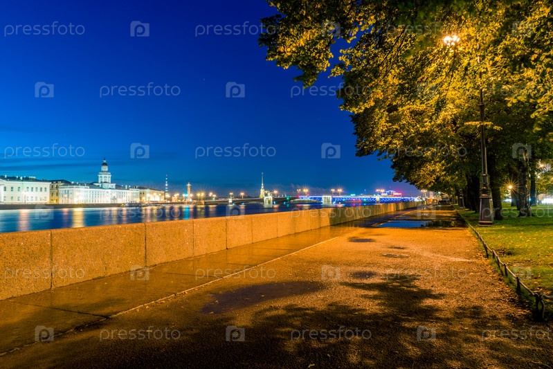 Ночной вид на набережную реки Невы в городе Санкт-Петербург. Россия