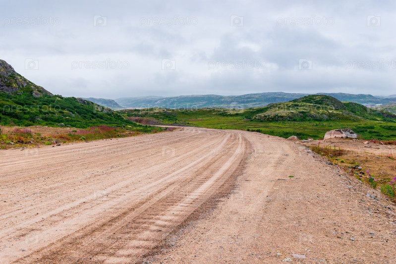 Грунтовая дорога в полярном ландшафте с гранитными камнями и растениями