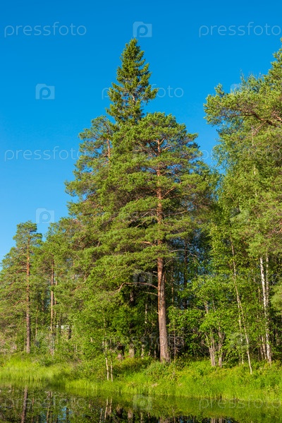 Берег озера у леса с отражениями в воде Россия, Карелия. Лесная река