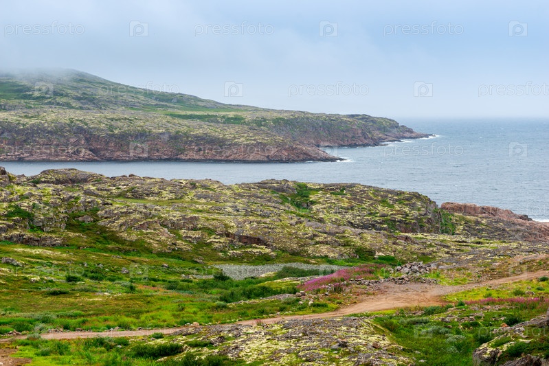 Летняя тундра. Скалистое побережье Баренцева моря около Териберки. Пейзаж русского Севера. Кольский полуостров, Мурманская область, Россия