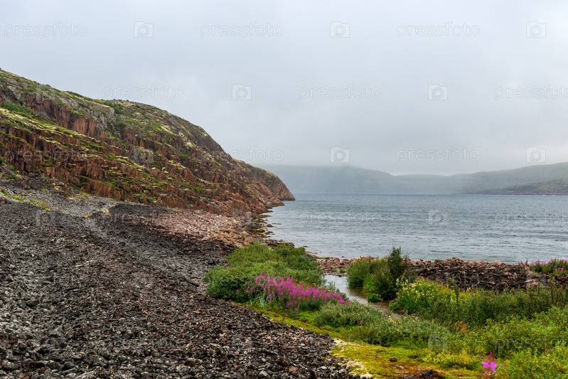 Летняя тундра. Скалистое побережье Баренцева моря около Териберки. Пейзаж русского Севера. Кольский полуостров, Мурманская область, Россия