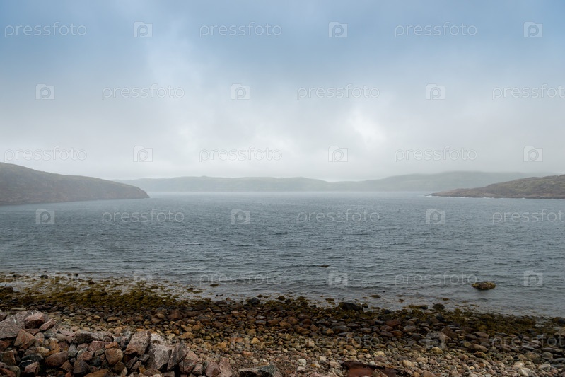Летняя тундра. Скалистое побережье Баренцева моря около Териберки. Пейзаж русского Севера. Кольский полуостров, Мурманская область, Россия