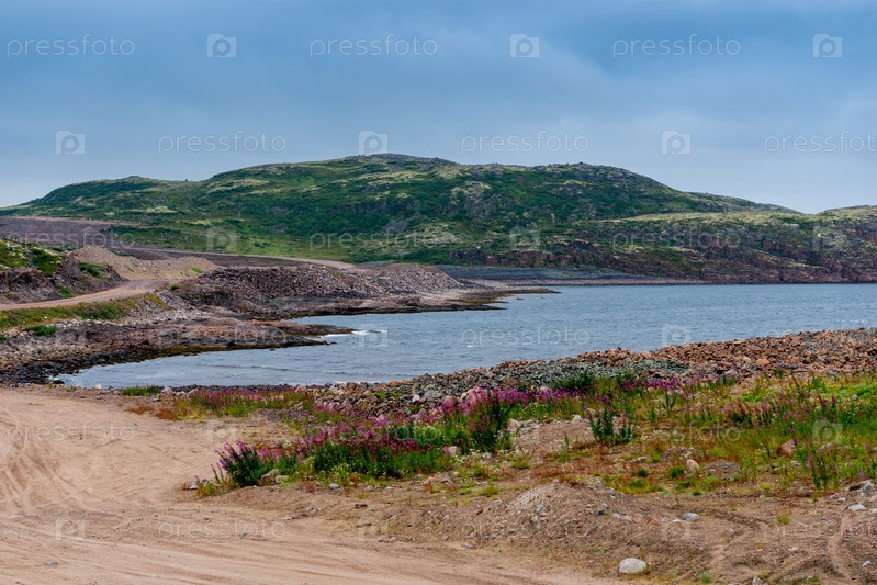 Полярный пейзаж с гранитными камнями и растениями. Северное озеро на каменном берегу