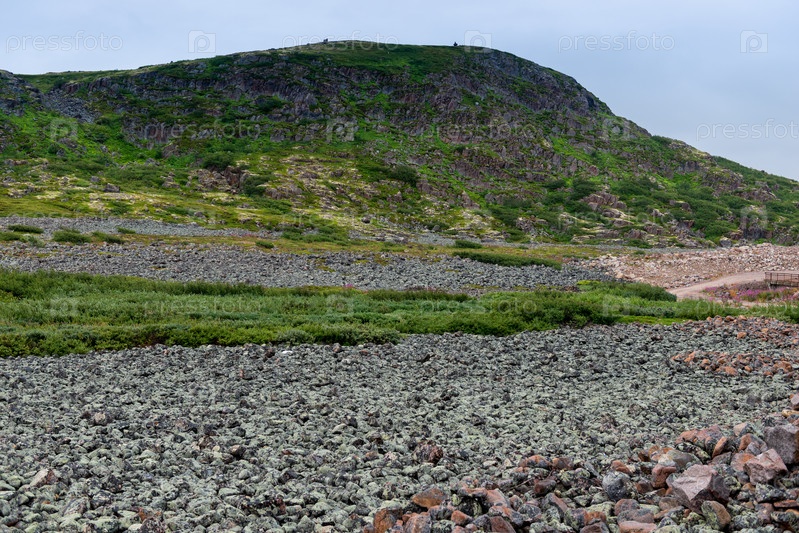 Летний пейзаж зеленой полярной тундры с валунами на переднем плане. Северная природа в окрестностях Териберки (Кольский полуостров, Россия)