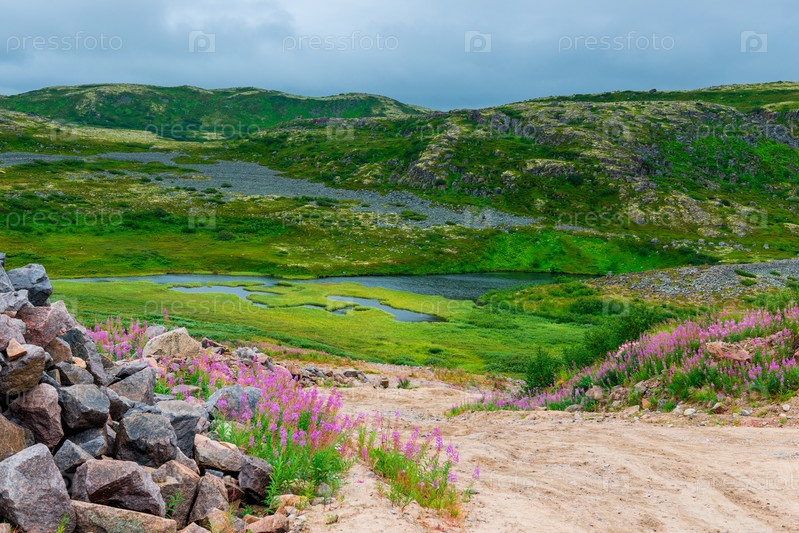 Грунтовая дорога в полярном ландшафте с гранитными камнями и растениями
