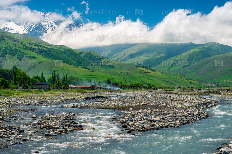 Бурная горная река, текущая среди камней. Северный Кавказ. Россия
