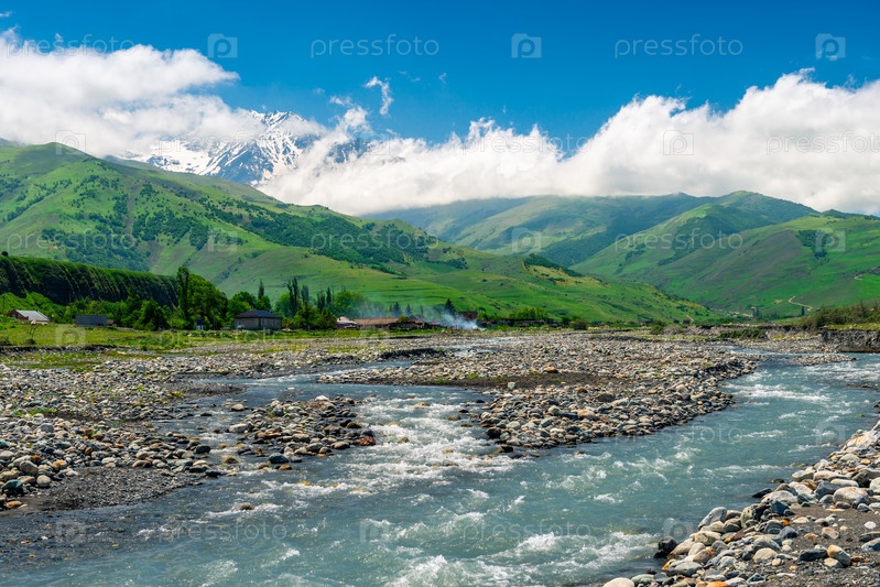 Бурная горная река, текущая среди камней. Северный Кавказ. Россия