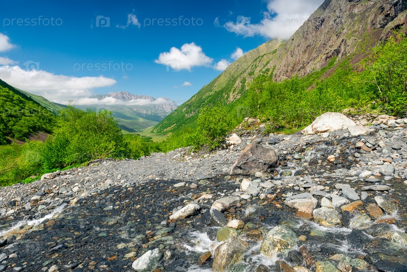 Красивый вид на каменистую горную реку в ущелье Северного Кавказа. Россия