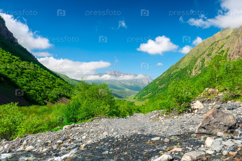 Красивый вид на каменистую горную реку в ущелье Северного Кавказа. Россия
