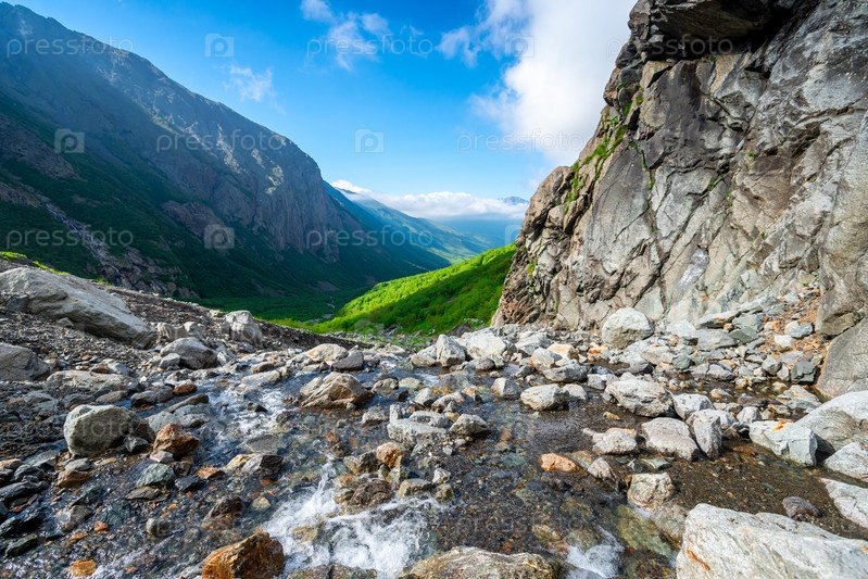 Красивый вид на каменистую горную реку в ущелье Северного Кавказа. Россия